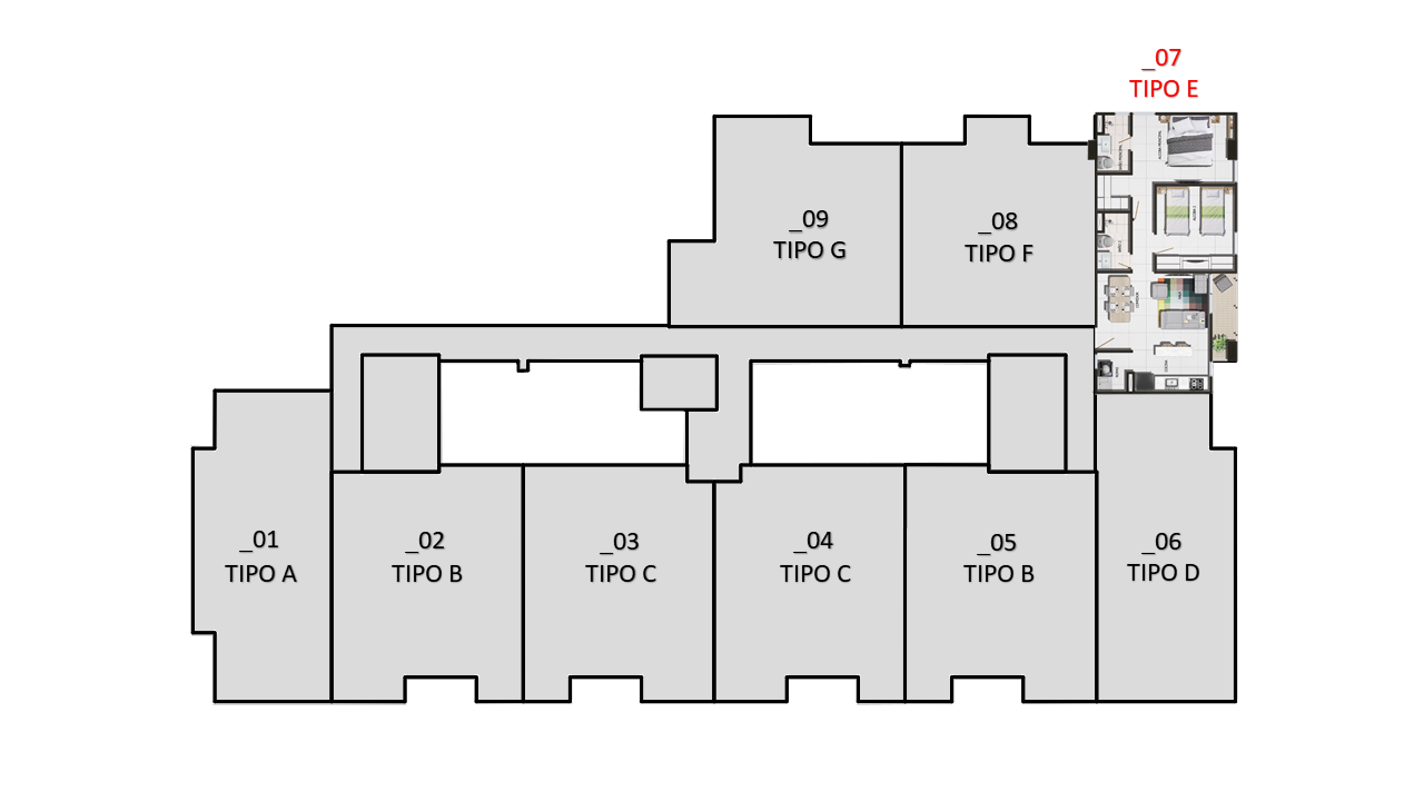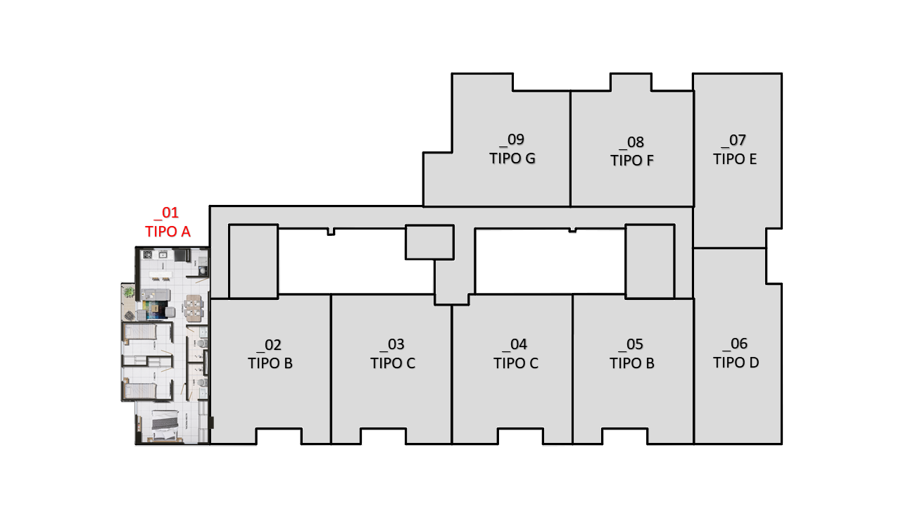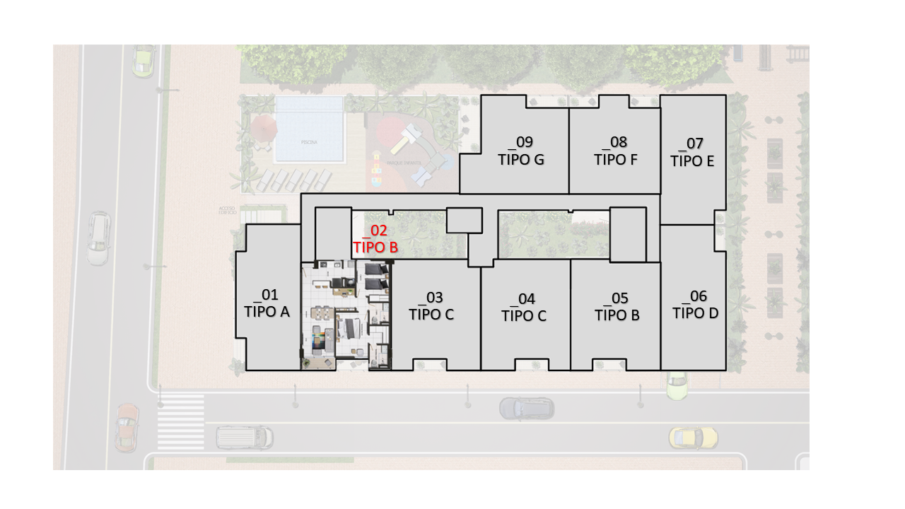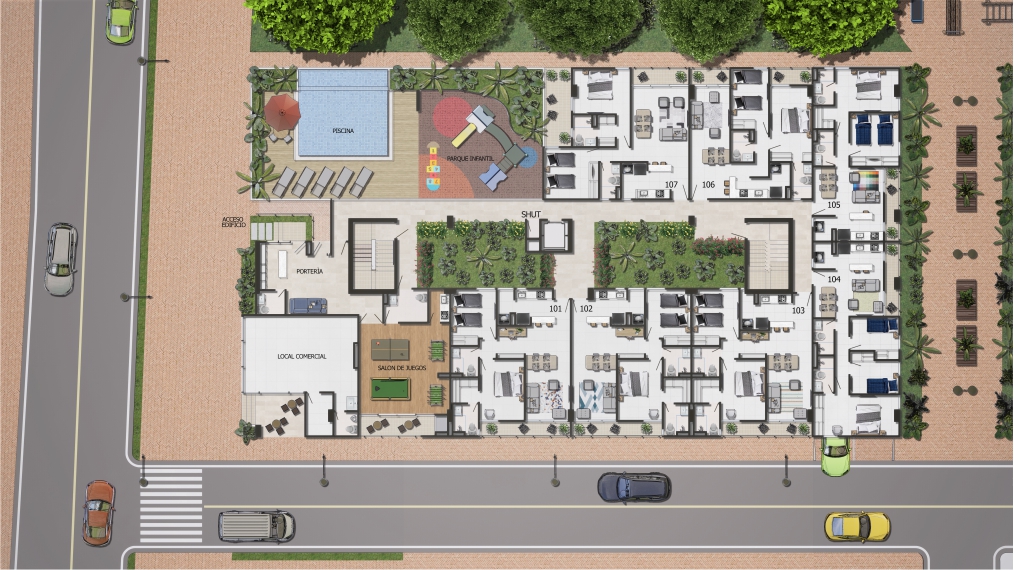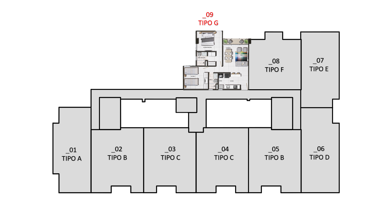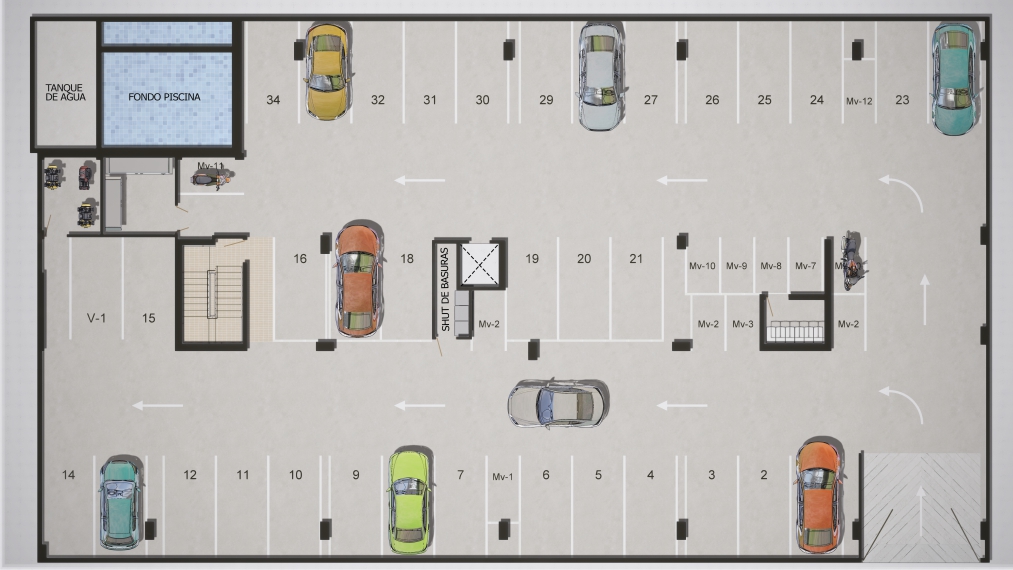 El proyecto consta de 1 torres de apartamentos con cuatro pisos con 7 apartamentos en primer piso 9 apartamentos desde el piso 2 al 4 para un total de 34 apartamentos con 35 parqueaderos privados ubicados en sótano.