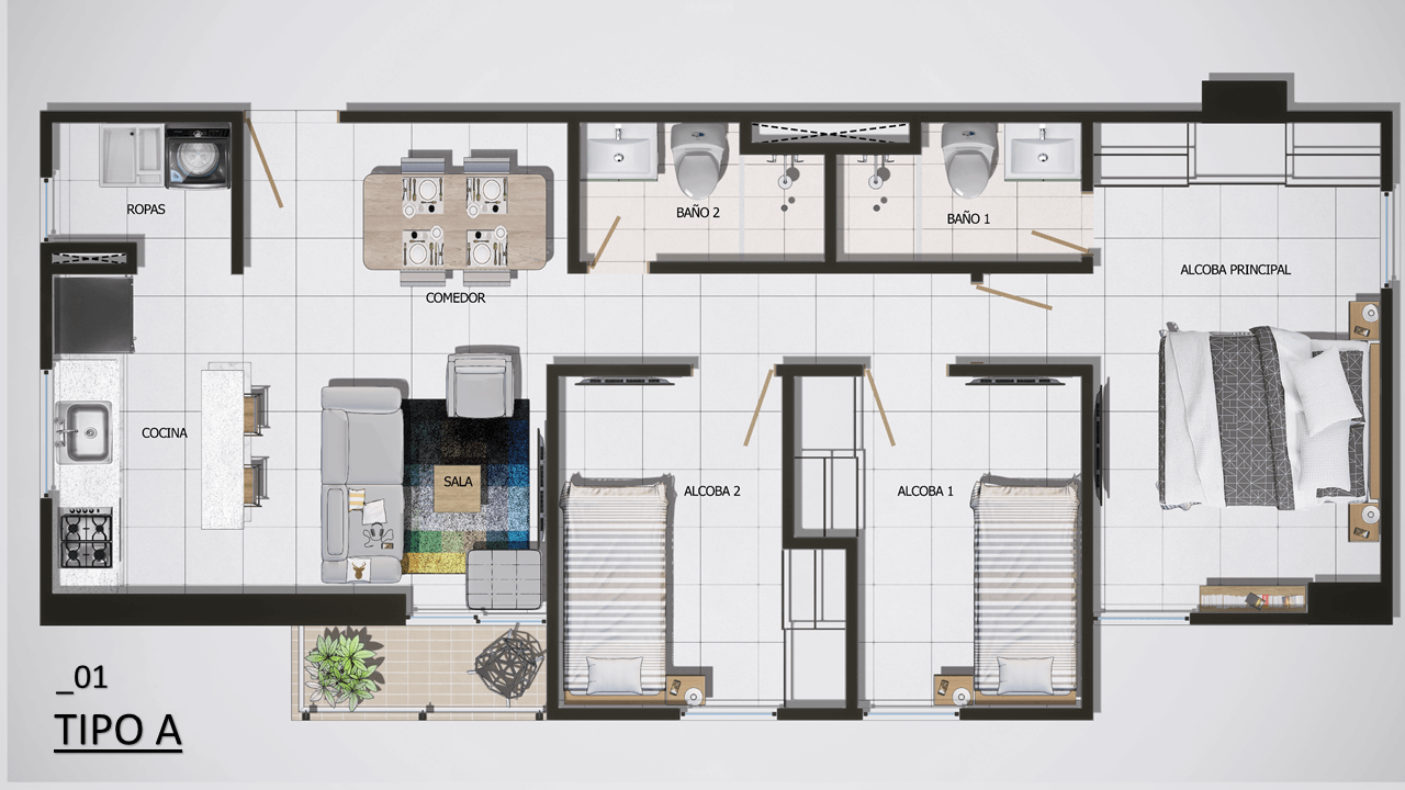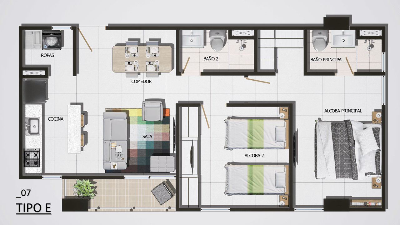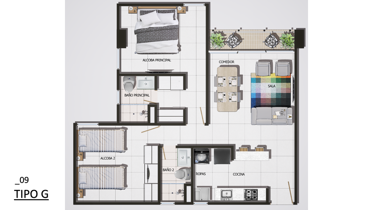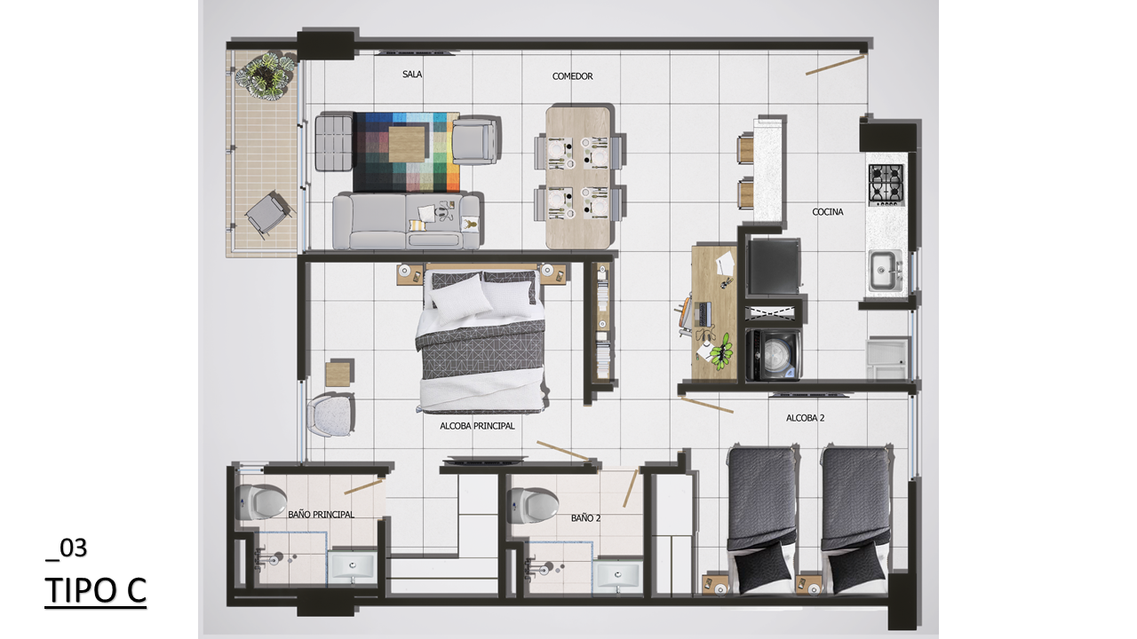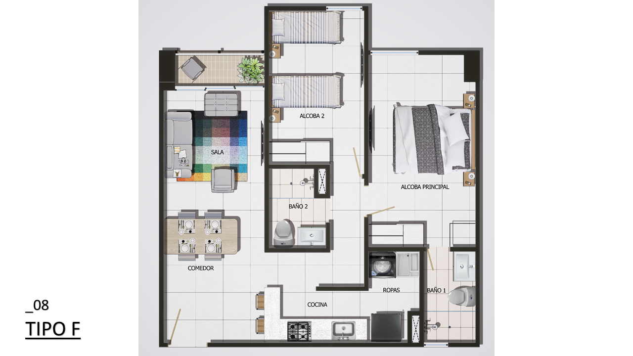 El proyecto consta de 1 torres de apartamentos con cuatro pisos con 7 apartamentos en primer piso 9 apartamentos desde el piso 2 al 4 para un total de 34 apartamentos con 35 parqueaderos privados ubicados en sótano.